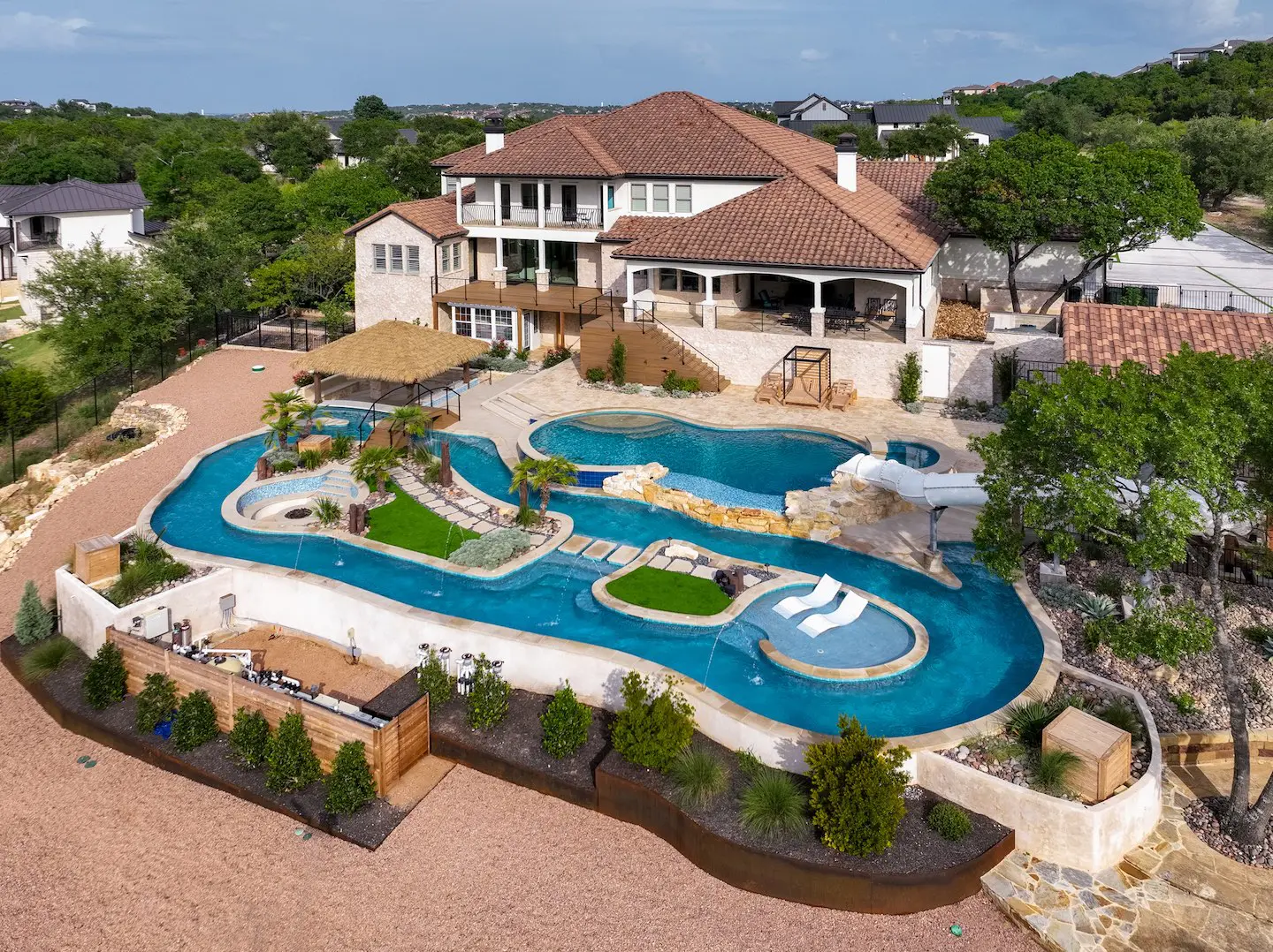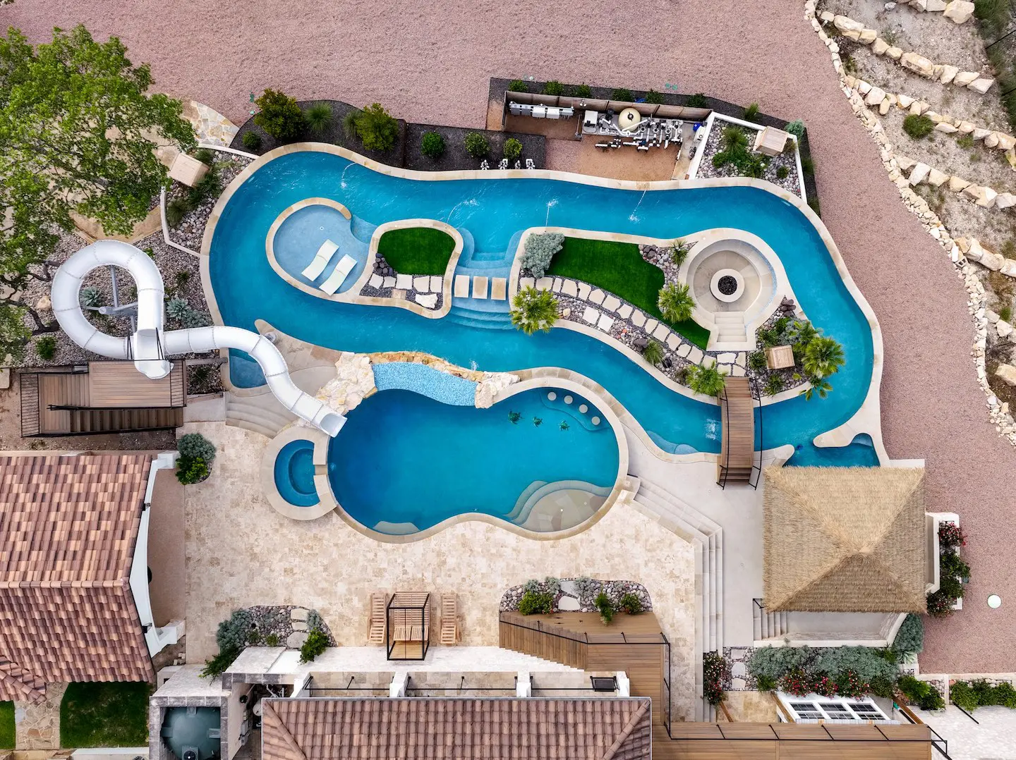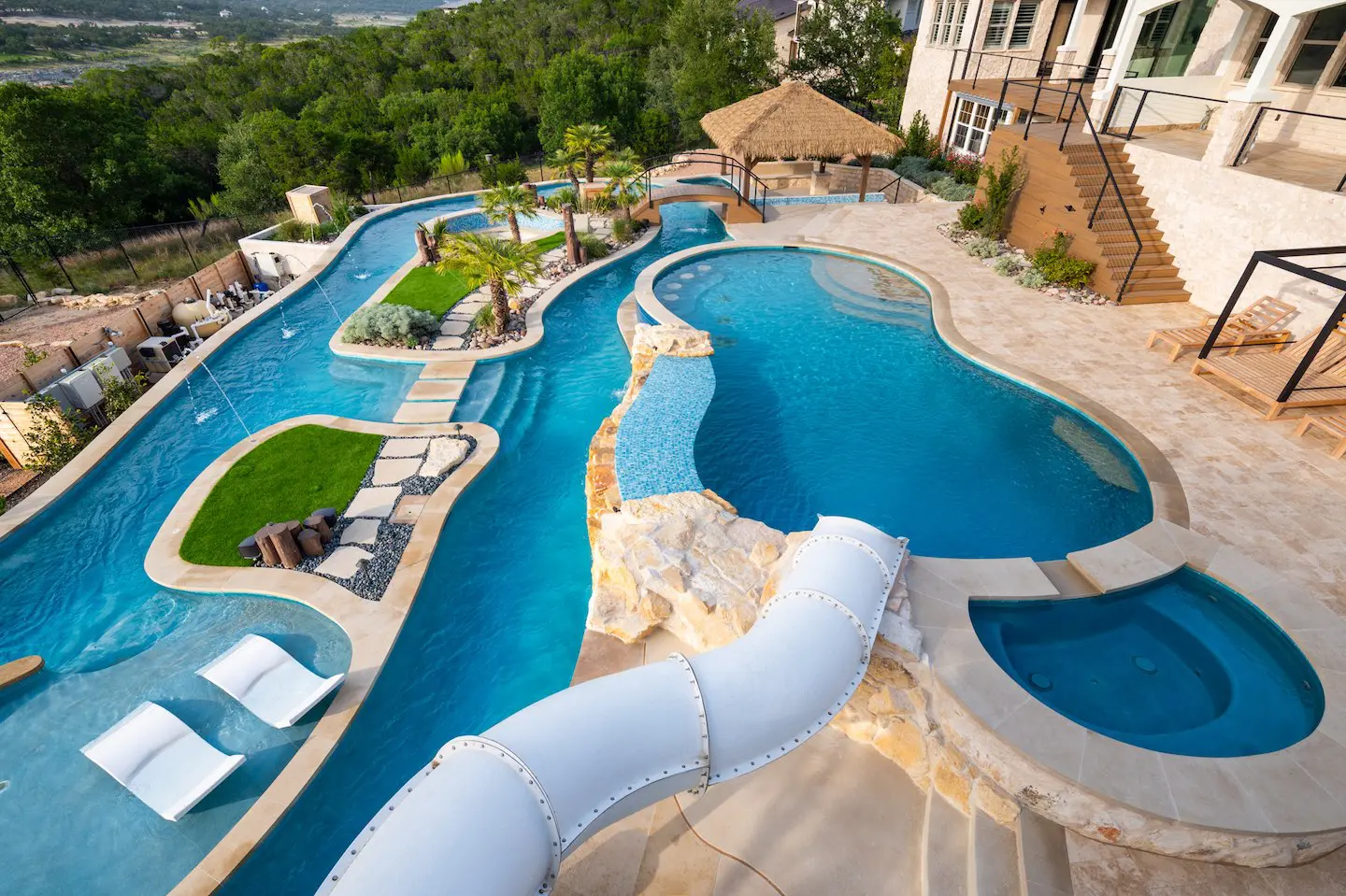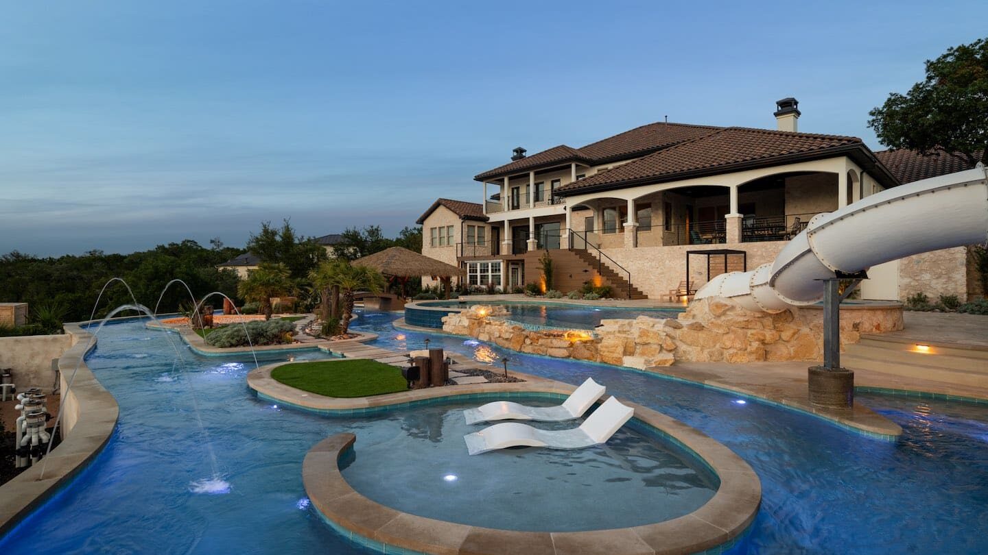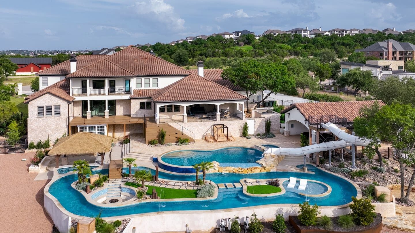 A backyard transformation in Spicewood, TX! This stunning renovation features a revamped pool, a winding lazy river, an exciting slide, and plenty of outdoor living spaces. With travertine decking, lueder coping, and a tropical-style palapa, we brought a touch of luxury and coastal charm — all wrapped up in fun!
