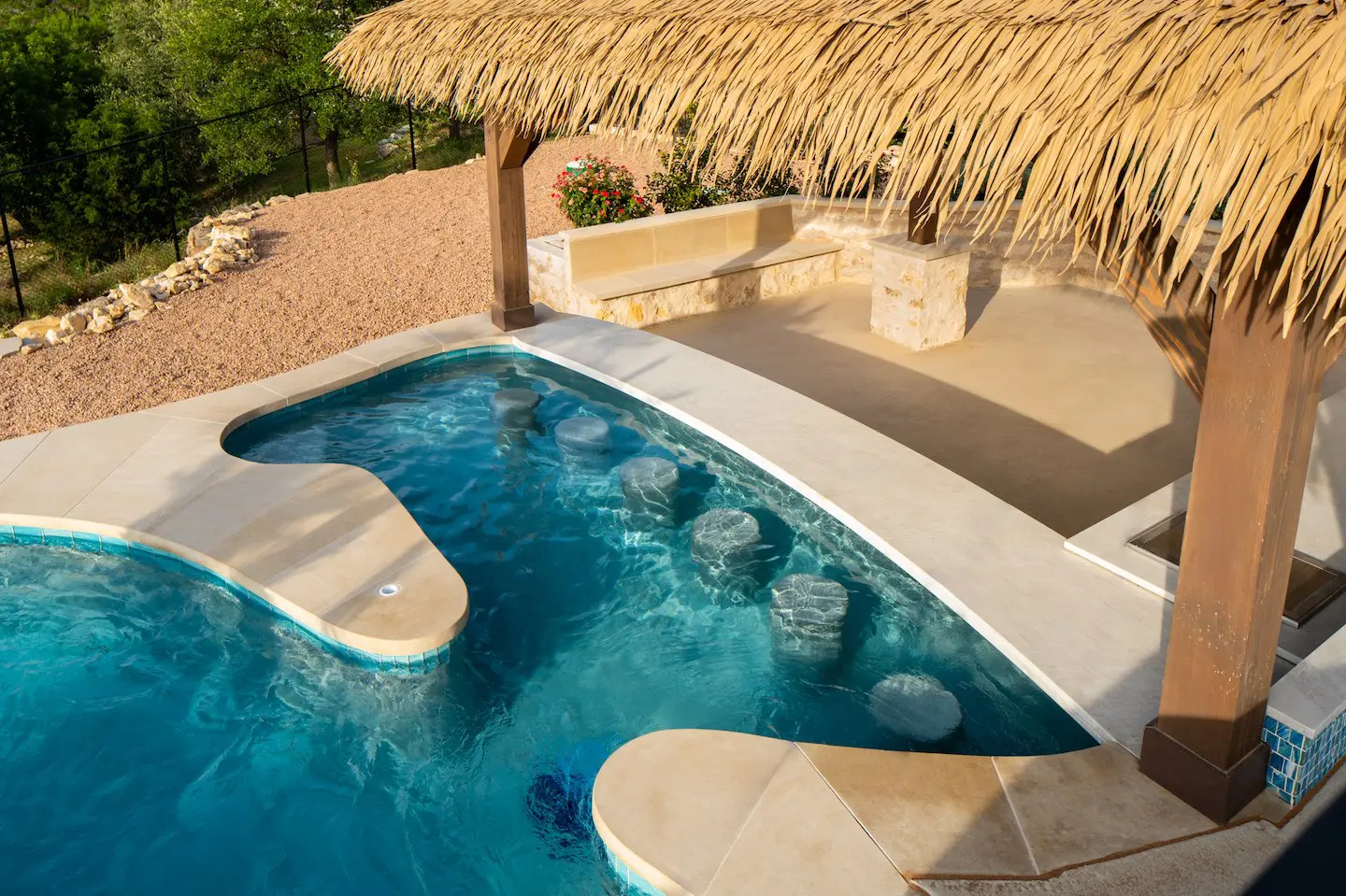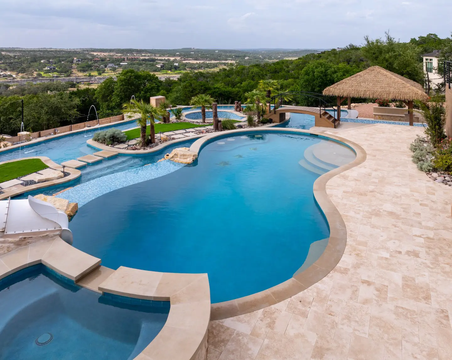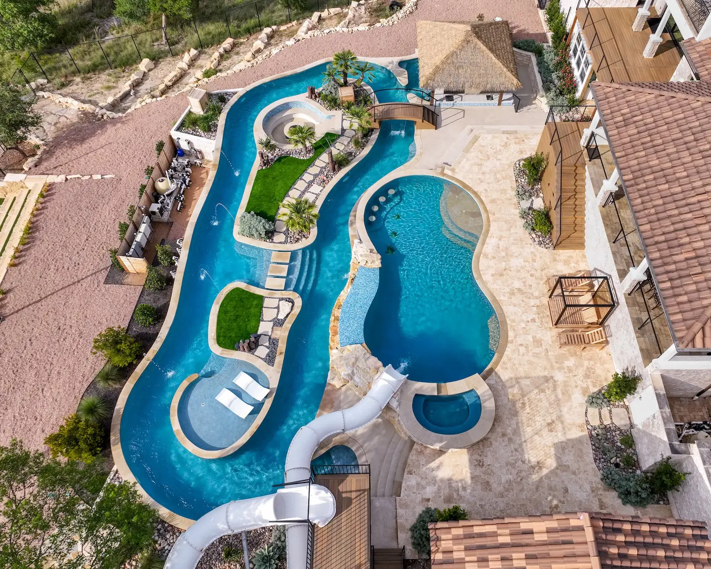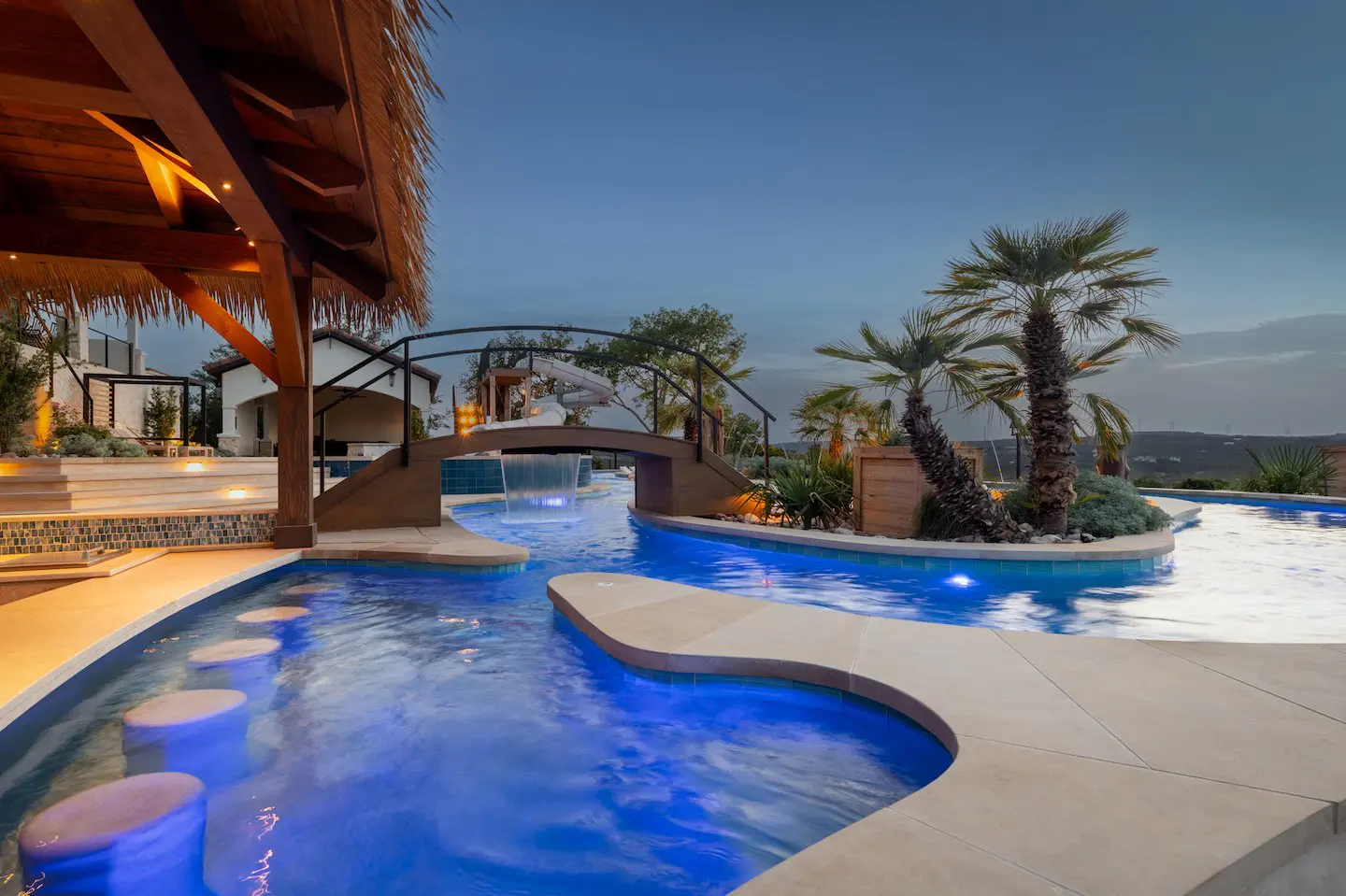 A backyard transformation in Spicewood, TX! This stunning renovation features a revamped pool, a winding lazy river, an exciting slide, and plenty of outdoor living spaces. With travertine decking, lueder coping, and a tropical-style palapa, we brought a touch of luxury and coastal charm — all wrapped up in fun!