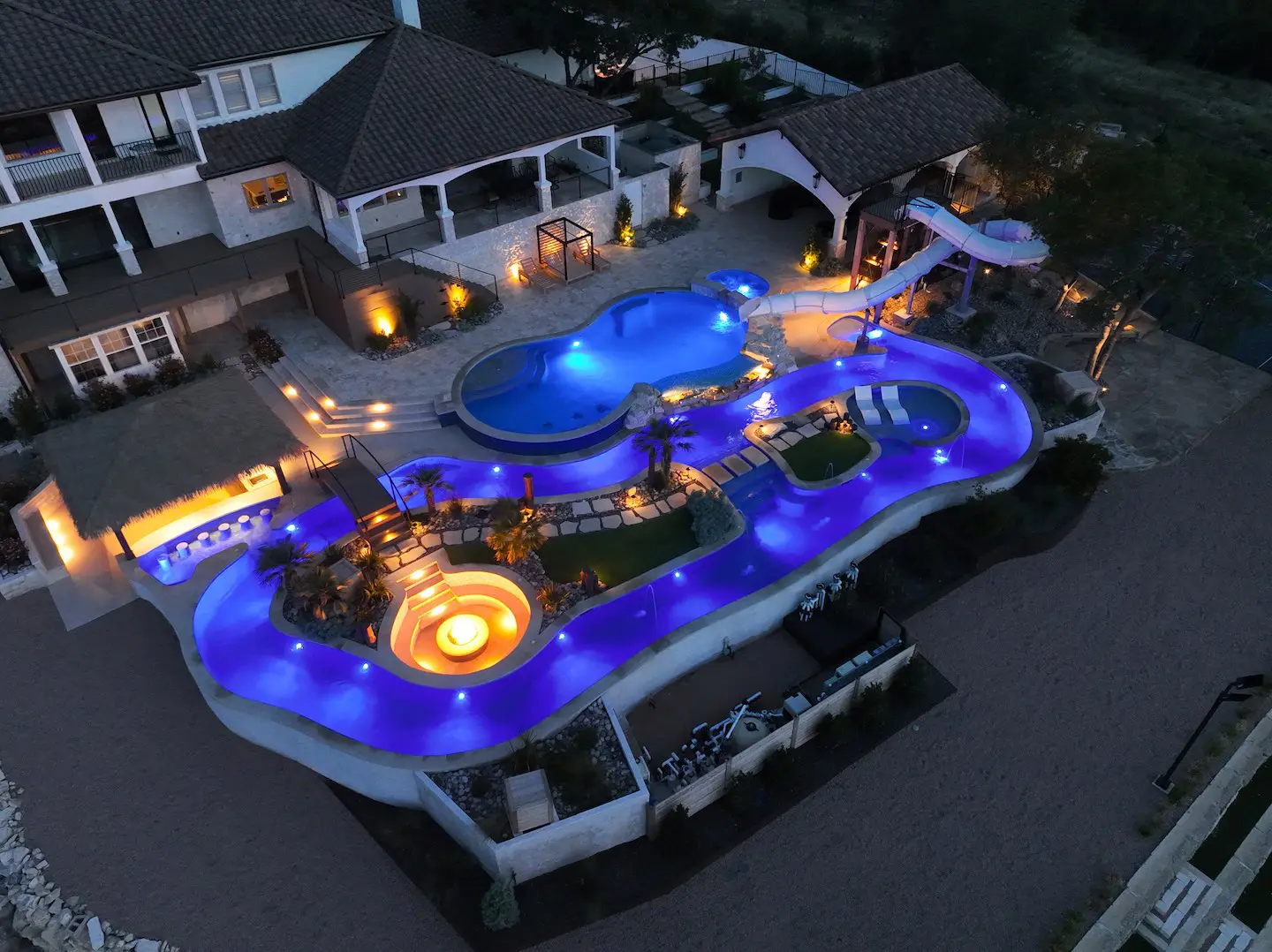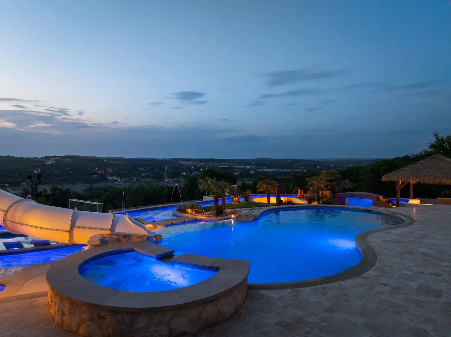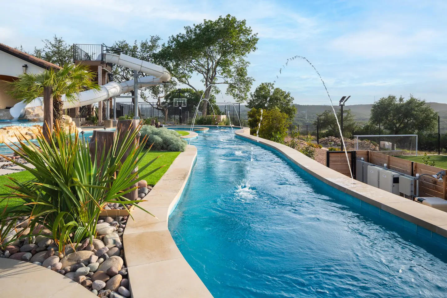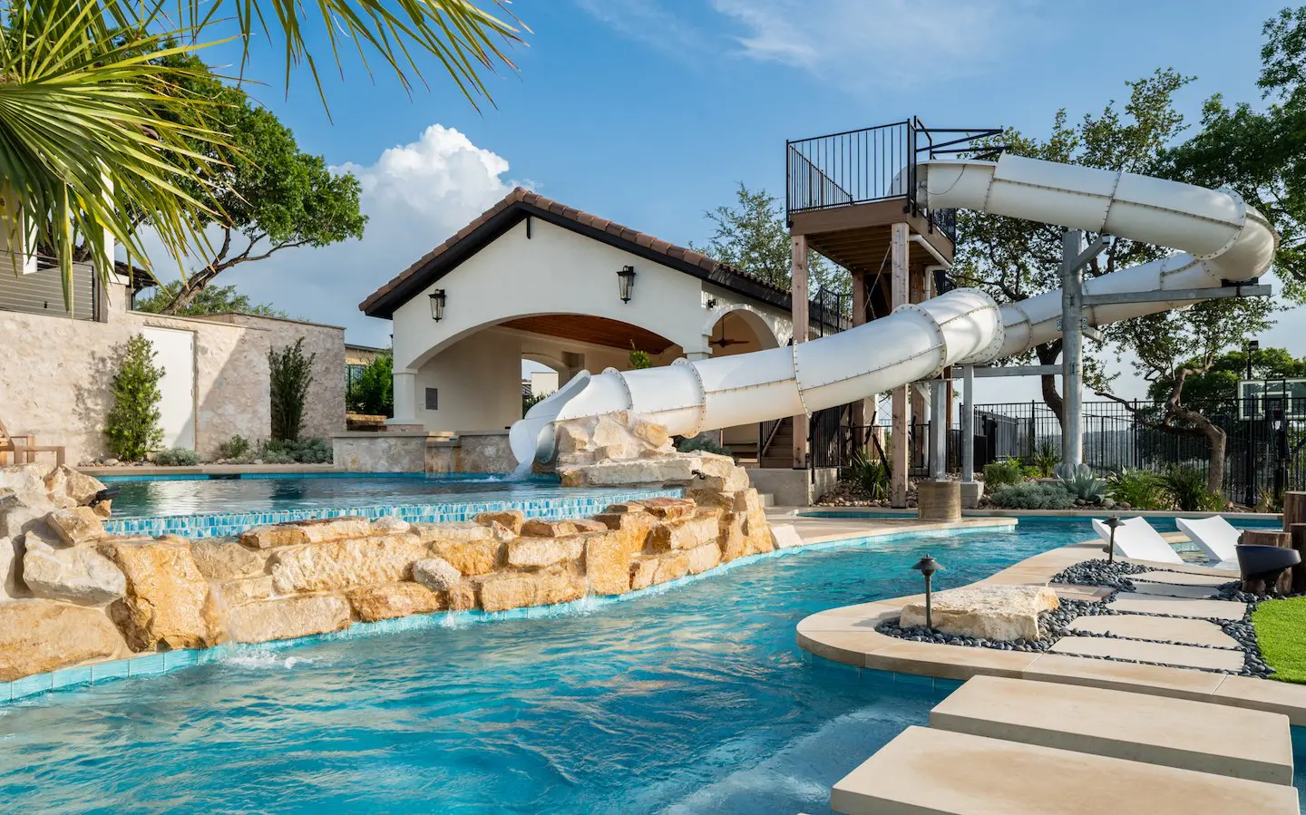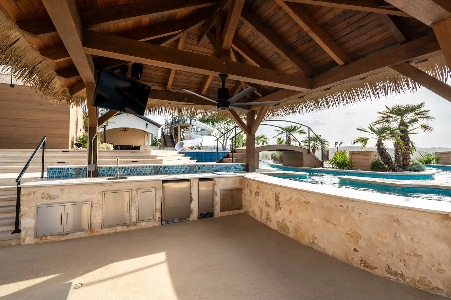 A backyard transformation in Spicewood, TX! This stunning renovation features a revamped pool, a winding lazy river, an exciting slide, and plenty of outdoor living spaces. With travertine decking, lueder coping, and a tropical-style palapa, we brought a touch of luxury and coastal charm — all wrapped up in fun!