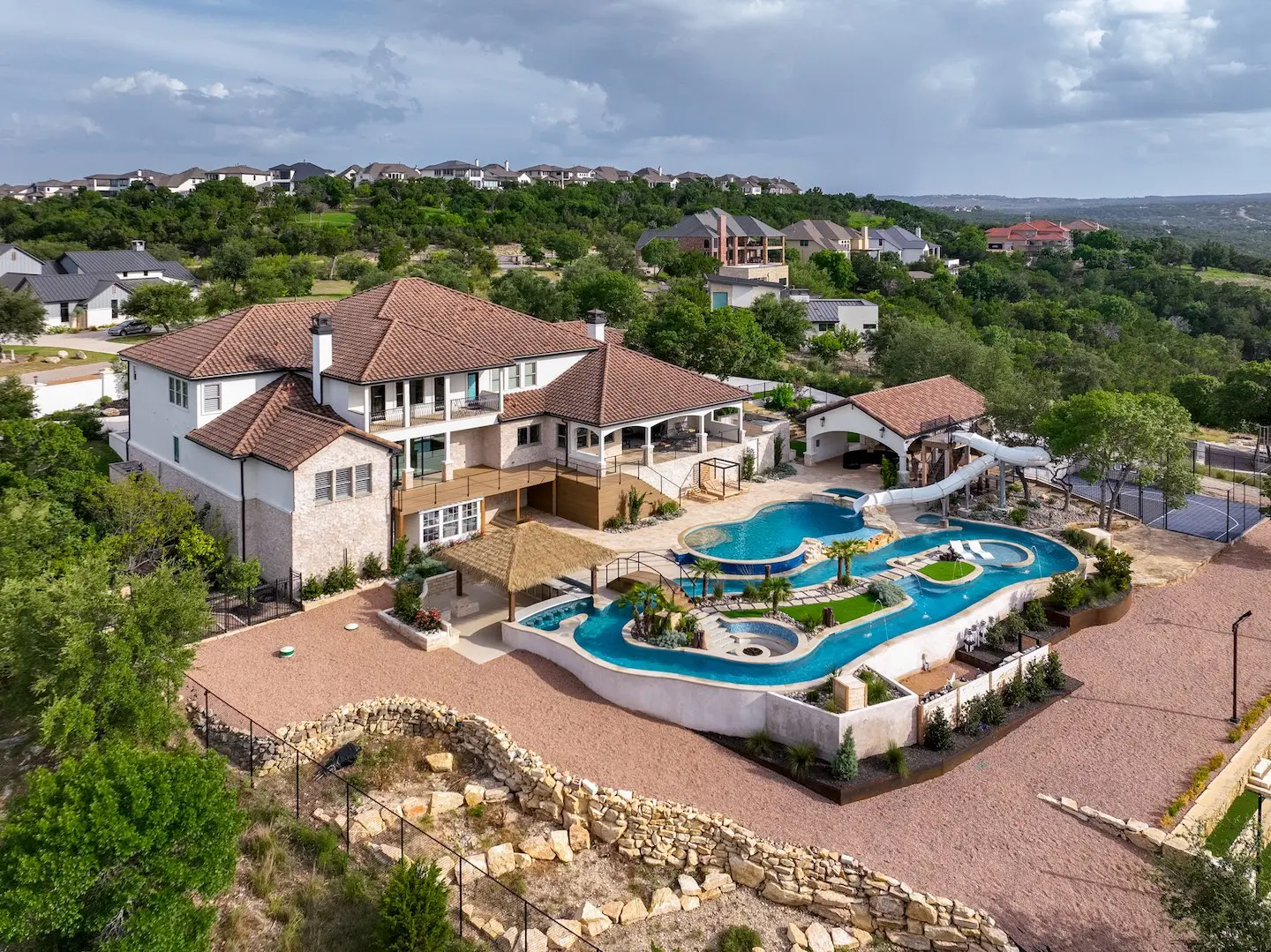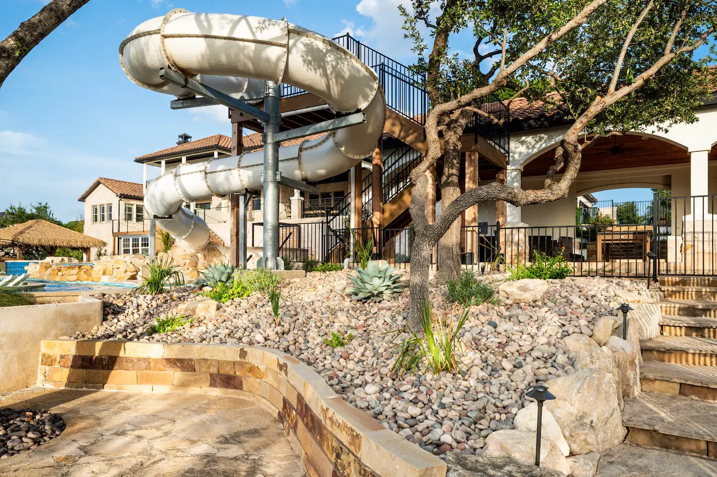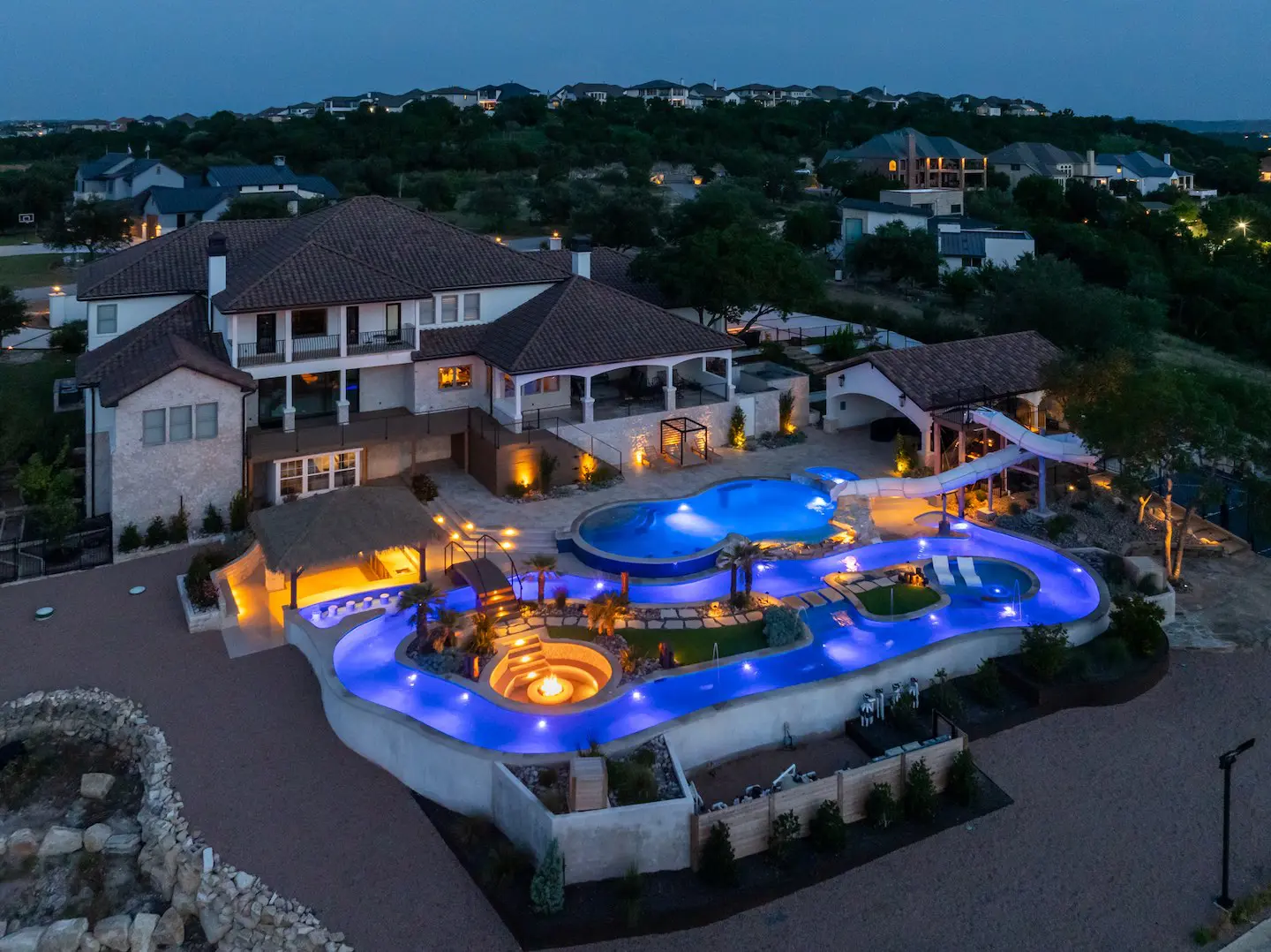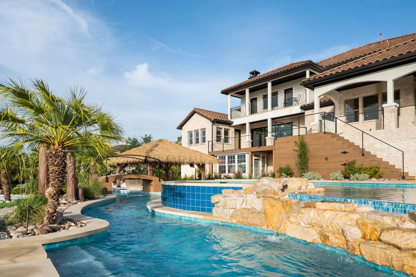 A backyard transformation in Spicewood, TX! This stunning renovation features a revamped pool, a winding lazy river, an exciting slide, and plenty of outdoor living spaces. With travertine decking, lueder coping, and a tropical-style palapa, we brought a touch of luxury and coastal charm — all wrapped up in fun!