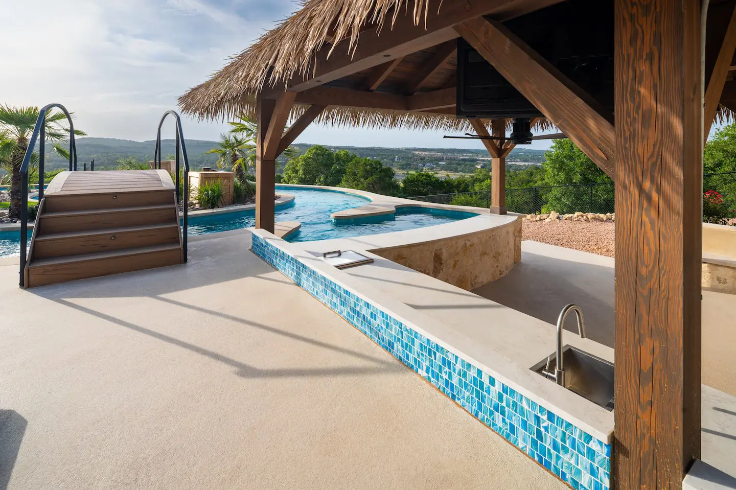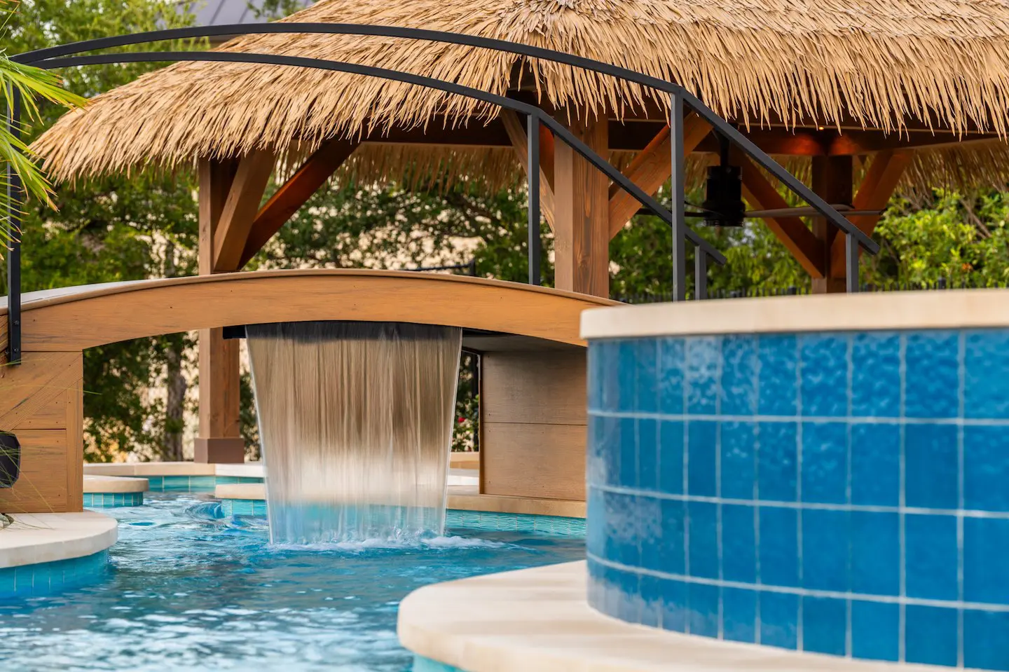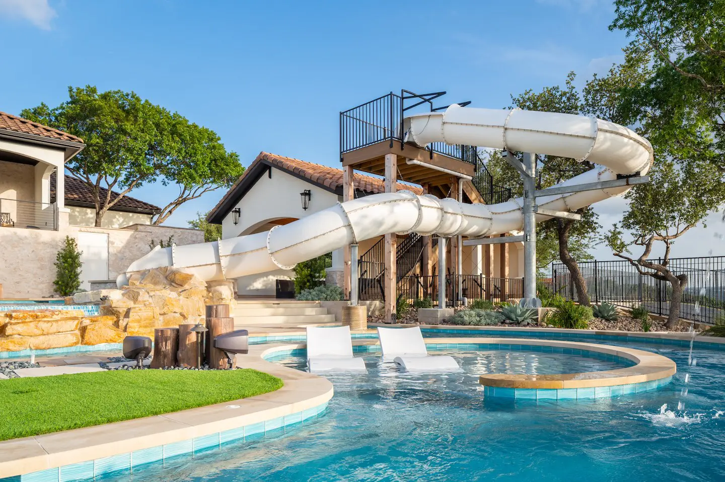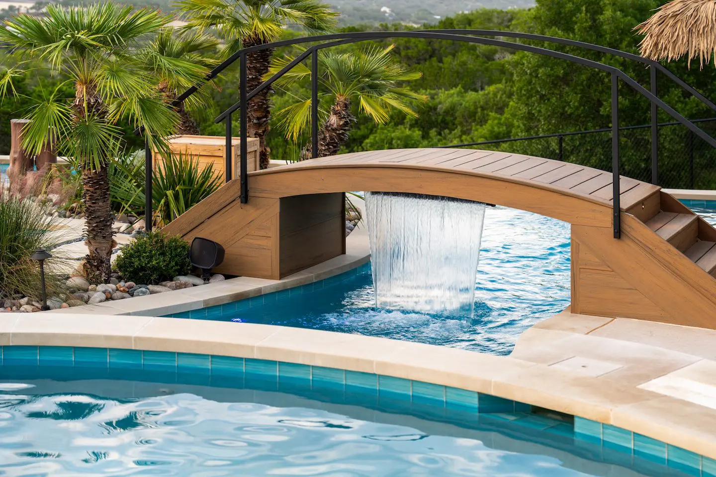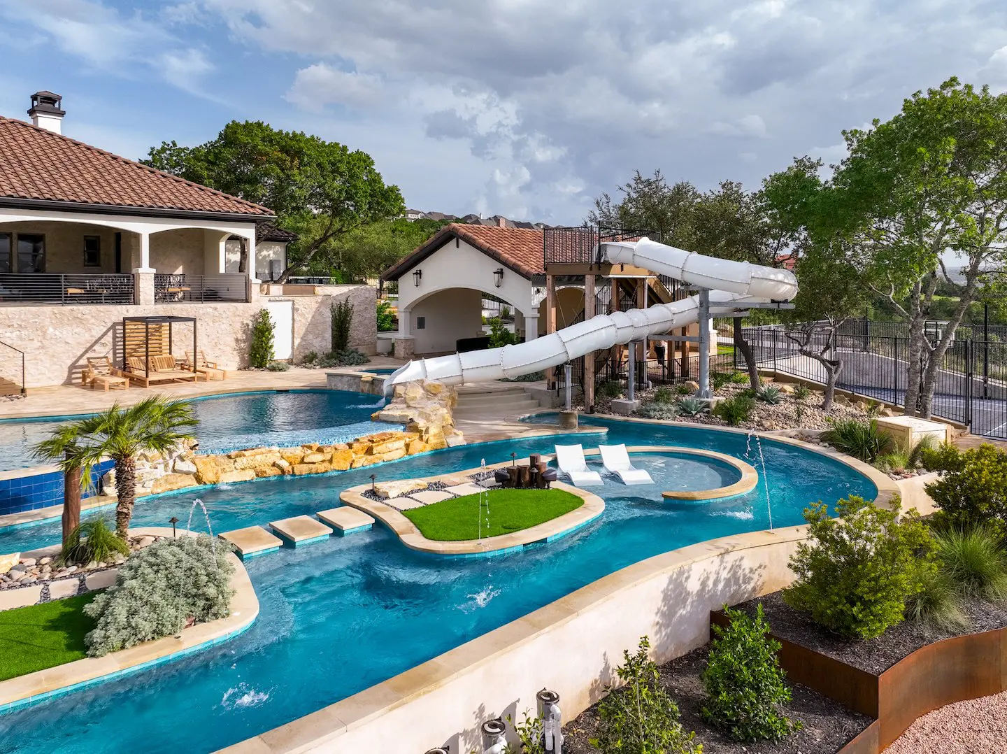 A backyard transformation in Spicewood, TX! This stunning renovation features a revamped pool, a winding lazy river, an exciting slide, and plenty of outdoor living spaces. With travertine decking, lueder coping, and a tropical-style palapa, we brought a touch of luxury and coastal charm — all wrapped up in fun!