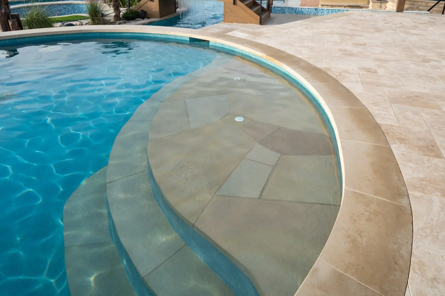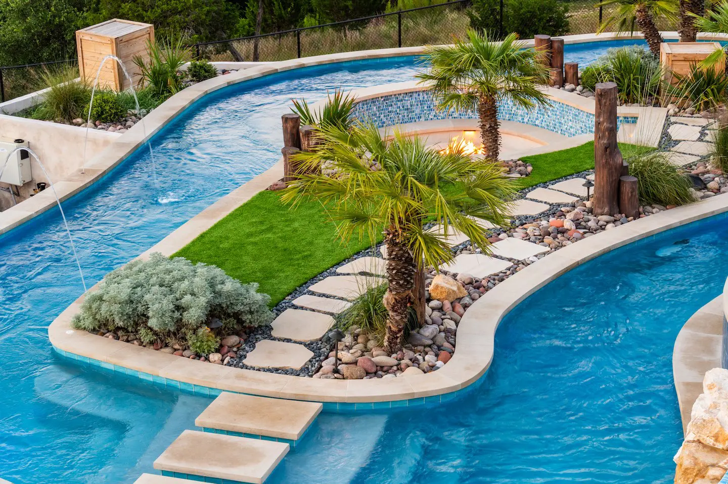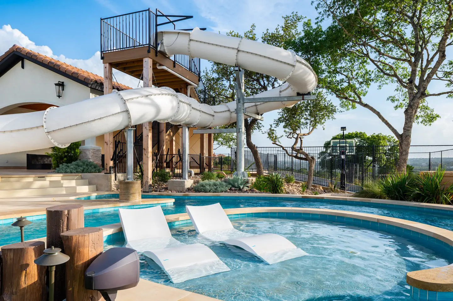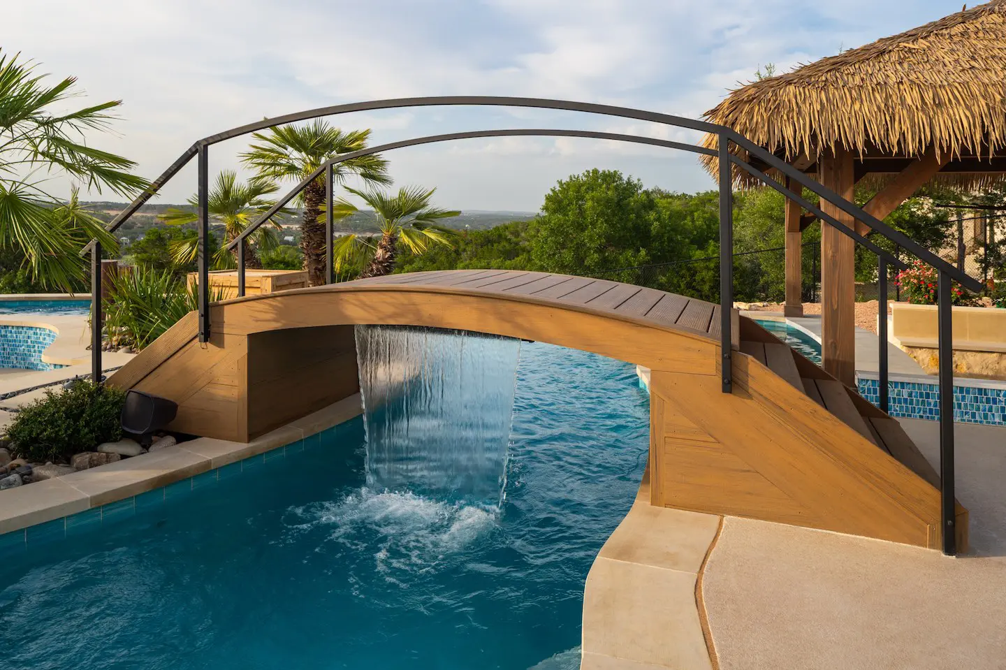 A backyard transformation in Spicewood, TX! This stunning renovation features a revamped pool, a winding lazy river, an exciting slide, and plenty of outdoor living spaces. With travertine decking, lueder coping, and a tropical-style palapa, we brought a touch of luxury and coastal charm — all wrapped up in fun!